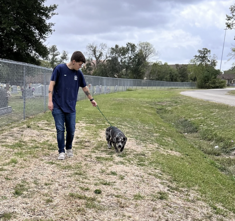 All alone, a speckled dog named Magnolia barked desperately from where she was tied behind a cemetery in Beaumont, Texas. The frightened dog needed someone to notice her. Luckily, her calls for help soon reached the ears of Beaumont Animal Care staff, who dashed into the woods behind the cemetery, following the noise.